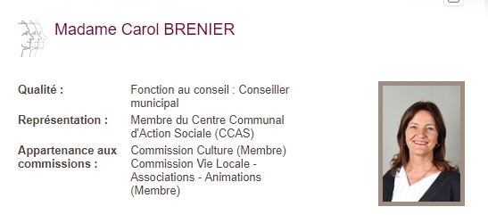Mairie de La Brè**** - Madame Carol BRENIER Qualité : Fonction au conseil : Conseiller municipal Représentation : Membre du Centre Communal d'Action Sociale (CCAS) Appartenance aux commissions : Commission Culture (Membre) Commission Vie Locale - Associations - Animations (Membre) |