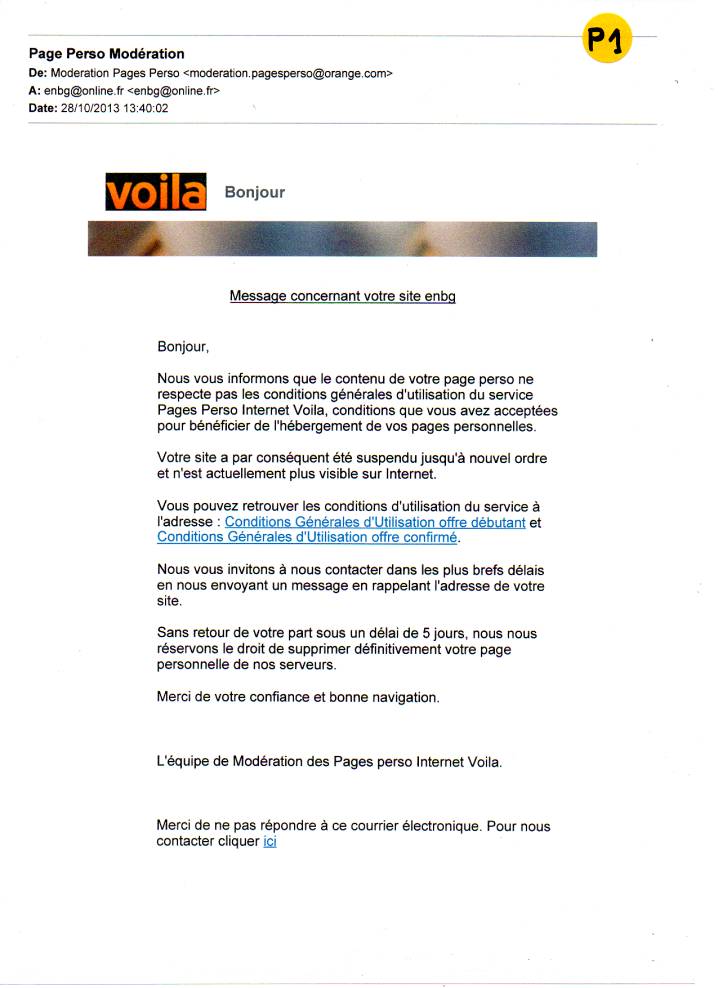 | Mon site créé le 28 mars 2003,sur VOILA http://enbg.voila.net/ Nom officiel du site : De la Corruption au Crime d'Etat puis migration effectuée le 17 juin 2010 par VOILA sur TELECOM / ORANGE. Mon site est bloqué depuis le lundi 28 octobre 2013 13:40 par moderation.pagesperso@orange.com. Pourquoi ???? | ||