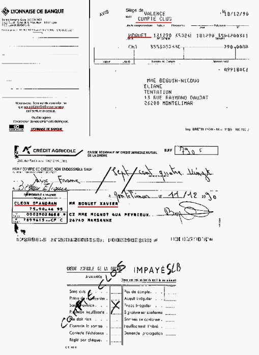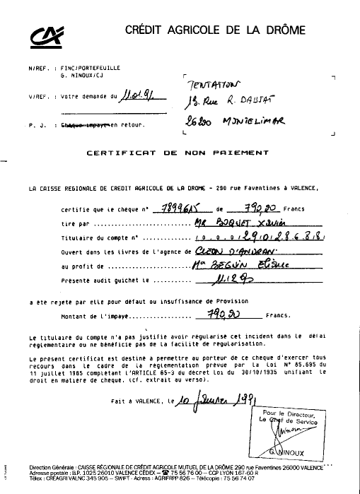 j'expédie une lettre au Commissaire ORFEUIL pour lui dire que le samedi 9 février 1991, j'ai demandé à déposer plainte contre Monsieur BOQUET XAVIER, pour chèque impayé sur un compte clos du CREDIT AGRICOLE de CLEON-D'ANDRAN et contre la banque d'où émanait ce chèque.