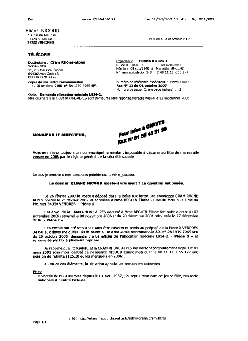 | Nouveau Fax [11ième] à la CRAM RHONE ALPES & la CNAVTS | Bas |