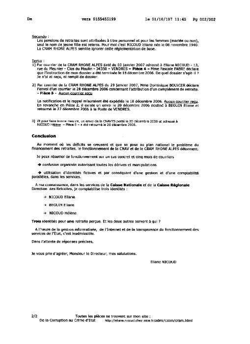 mardi 27 février 2007, je retourne à la Poste de VENDRES le courrier Pièce n° 1 avec mention "retour à l'expéditeur" car il ne me concerne pas. Les retraites ou pensions sont délivrées à titre nominatif. Mon nom et ma retraite sont au nom de NICOUD Eliane. C'est le quatrième courrier que je retourne à cet organisme qui m'attribue des noms fantaisistes, Béguin Eliane, Nicoud Hélène ..ect... Je pense donc sérieusement que cet organisme établit de faux dossiers ! |