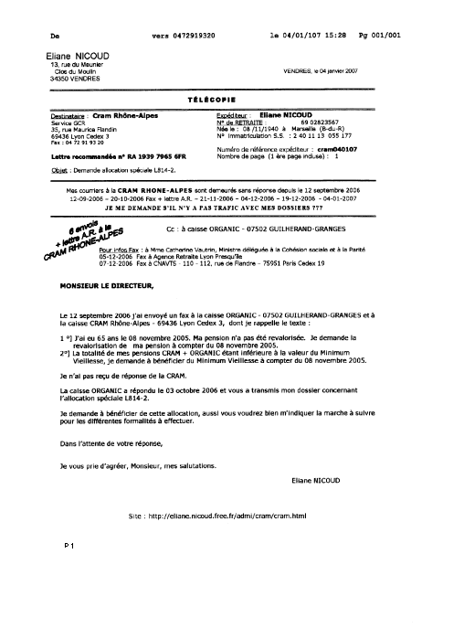 Cet envoi de la CRAM RHONE ALPES adressé à Mme BEGUIN Eliane fait suite à ceux du 02 novembre 2006 retourné le 08 novembre 2006 et du 20 décembre 2006 retourné le 27 décembre 2006. - Pièce 2 - Ces envois ont été retournés sans être ouverts et remis au préposé de la Poste à VENDRES 34350 aux dates indiquées. Ils faisaient suite à ma lettre recommandée AR. n° RA 1939 7965 6FR du 20 octobre 2006 demandant à bénéficier de l'allocation spéciale L814-2. - Pièce 3 - et renouvelée par fax à plusieurs reprises. Je rappelle que l'ORGANIC et la CRAM RHONE ALPES me versent conjointement depuis le 01 mars 2003 sous mon identité de naissance NICOUD Eliane matricule 2 40 11 13 055 177 une pension de retraite (125,20 euros mensuels en 2006). Au vu de ces éléments, la situation appelle les remarques suivantes : Primo :