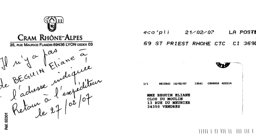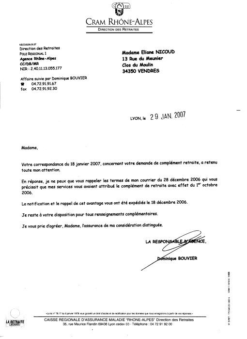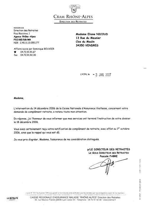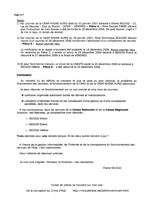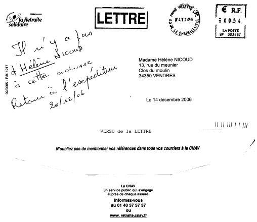 | mardi 27 février 2007, je retourne à la Poste de VENDRES le courrier Pièce n° 1 avec mention "retour à l'expéditeur" car il ne me concerne pas. Les retraites ou pensions sont délivrées à titre nominatif. Mon nom et ma retraite sont au nom de NICOUD Eliane. C'est le quatrième courrier que je retourne à cet organisme qui m'attribue des noms fantaisistes, Béguin Eliane, Nicoud Hélène ..ect... Je pense donc sérieusement que cet organisme établit de faux dossiers ! |