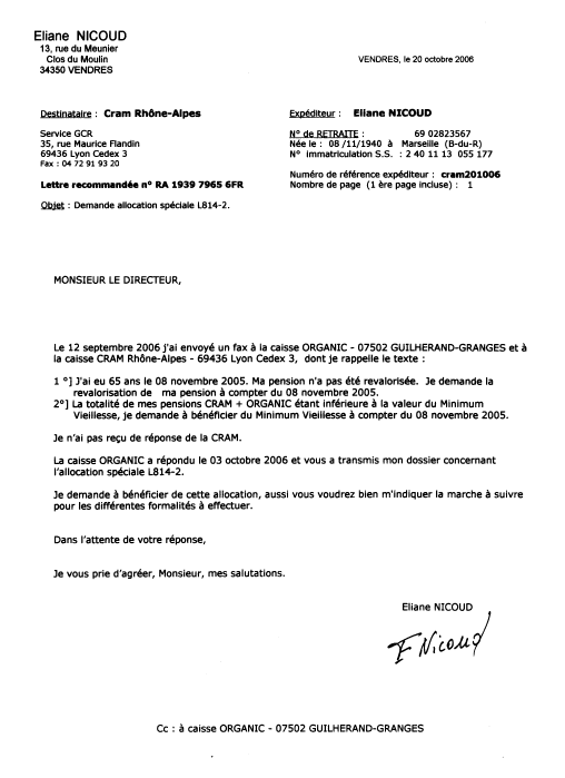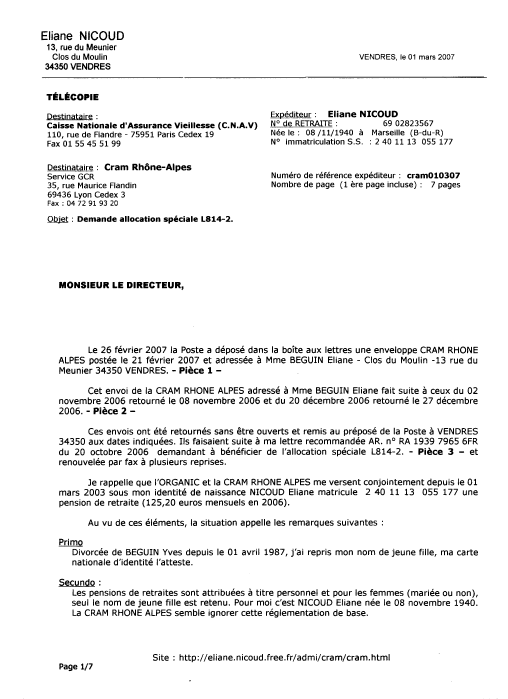 Pièce n° 2/1 - 08 NOV. 2006 - Retour à la poste lettre de la CRAM RHONE ALPES /BEGUIN Eliane Pièce n° 2/2 - 27 DEC. 2006 - Retour à la poste lettre de la CRAM RHONE ALPES /BEGUIN Eliane Pièce n° 3 - Ma lettre recommandée du 20 octobre 2006 demandant l'allocation spéciale L814-2. Pièce n° 4 - Lettre de la CRAM RHONE ALPES du 03 janvier 2007 Pièce n° 5 - Lettre de la CRAM RHONE ALPES du 29 janvier 2007 Pièce n° 6 - 20 DEC. 2006 - Retour à la poste lettre de la CNAVTS pour Hélène NICOUD |