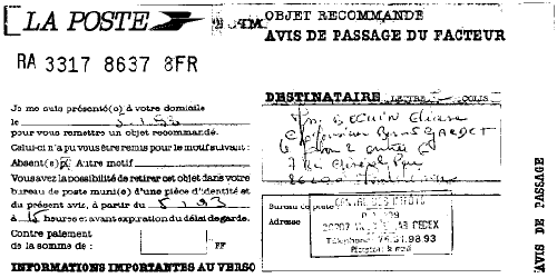 le 5 janvier 1993, je reçois une lettre recommandée avec accusé de réception de mise en demeure pour absence de déclaration de revenus de 1991. Je me suis déplacée en centre des Impôts rue Rodolphe BRINGER, où l'on n'a pas su me dire qui était Mme CROULET. Un fonctionnaire m'a reçue, j'ai présenté le double de ma déclaration ainsi que le certificat de non-imposition pour l'année 1991 ( mes revenus étant insuffisants). | ||||