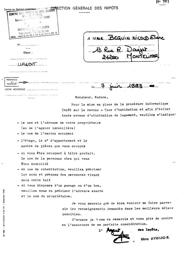 | Texte : Pour la mise en place de la procédure informatique Impôt sur le revenu - Taxe d'habitation et afin d'éviter toute erreur d'attribution de logement, veuilles m' indiquer: etc... Lagente des impôts : Mme AYMARD F. |