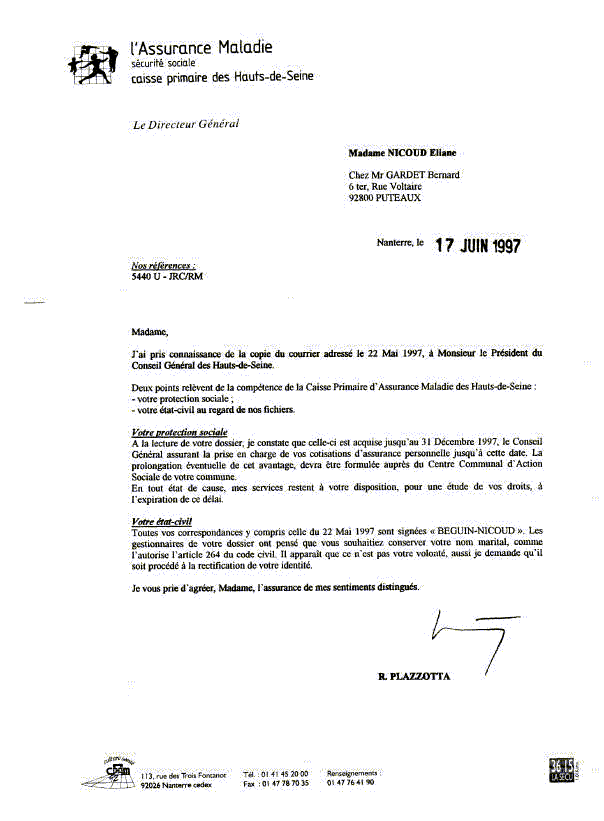 Votre protection sociale A la lecture de votre dossier, je constate que celle-ci est acquise jusqu'au 31 Décembre 1997, le Conseil Général assurant la prise en charge de vos cotisations d'assurance personnelle jusqu'à cette date. La prolongation éventuelle de cet avantage, devra être formulée auprès du Centre Communal d'Action Sociale de votre commune. En tout état de cause, mes services restent à votre disposition, pour une étude de vos droits, à l'expiration de ce délai. Votre état-civil Toutes vos correspondances y compris celle du 22 Mai 1997 sont signées « BEGUIN-NICOUD ». Les gestionnaires de votre dossier ont pensé que vous souhaitiez conserver votre nom marital, comme l'autorise l'article 264 du code civil. Il apparaît que ce n'est pas votre volonté, aussi je demande qu'il soit procédé à la rectification de votre identité. Je vous prie d'agréer, Madame, l'assurance de mes sentiments distingués. Le Directeur Général R. PLAZZOTTA |