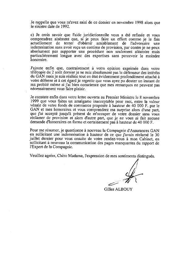 Avez-vous reçu la réponse de l'aide juridictionnelle pour laquelle j'ai déposé une demande le vendredi 20 novembre 1998 au Tribunal de Grande Instance de Nanterre concernant le GAN ? Le Tribunal devait vous l'expédier le jeudi 26 novembre 1998 afin que vous me transmettiez une copie. Si oui, j'aimerais un rendez-vous, pour vous dépose mon dossier. Je vous remercie de votre réponse. Mme Nicoud Eliane |