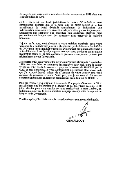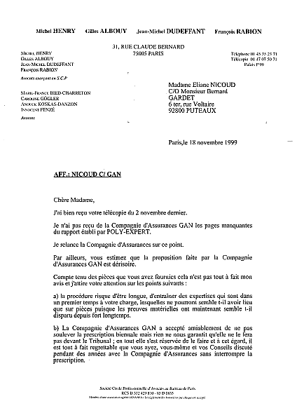 18 novembre 1999 : Réponse de Maître ALBOUY. Le Gan assurance ne donne pas les pièces manquantes du rapport.
