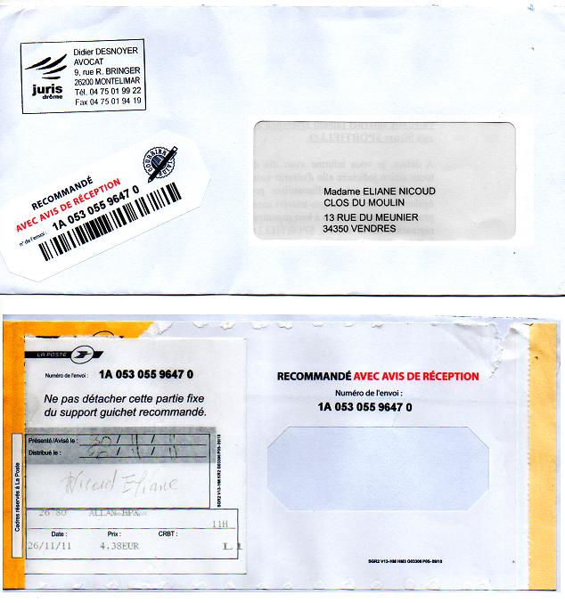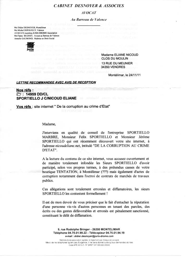Cher Maître, Nous accusons réception de votre courrier avec A.R. reçu le 30 novembre 2011. Pour votre information nos lettres sont sur Internet depuis 1999, notamment celle du 18 septembre 1997 adressée à Monsieur le Préfet des Hauts de Seine Jean-Pierre RICHER qui parle du Sieur SPORTIELLO Félix (fils). Le site « De la Corruption au Crime d'Etat » à l'adresse nicoudeliane.net cité en référence dans votre courrier est ouvert depuis mai 2005. Il reprend le contenu des sites ouverts depuis 1999. Votre découverte du site apparaît bien tardive compte tenu de l'efficacité des moteurs de recherche sur Internet depuis quelques années. Toutefois, compte tenu de la conjoncture économique difficile actuellement, nous considérons que les salariés de l'entreprise n'ont pas à pâtir d'une image négative résultant des turpitudes d'un dirigeant. Exceptionnellement nous avons décidé d'accéder à votre demande en retirant les phrases concernant l'entreprise SPORTIELLO. Cependant, nous nous réservons toute latitude de déposer plainte contre le Sieur SPORTIELLO Félix (fils) si la situation devait se compliquer. Nous vous invitons à prendre connaissance du bien fondé de nos dires sur : http://nicoudeliane.net/prefets/prefet97/prefet97.html#BLANC Nous vous prions de croire, Cher Maître, en l'assurance de nos sentiments respectueux. Eliane NICOUD |