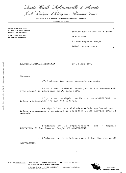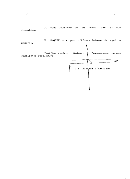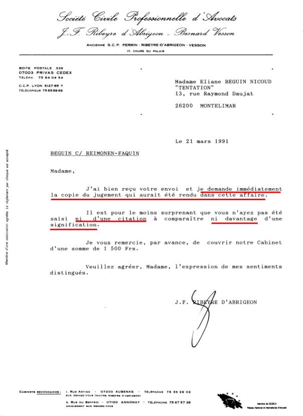 Waquet a expédié à Ribeyre D'Abrigeon la copie de l'arrêt de la chambre Criminelle rendu sur mon pourvoi par courrier. Il a fallu attendre le 14 septembre 1993 pour que j'ai la grosse de la Cassation du 20 Mars 1991. 14 mai 1991 : lettre de mon avocat Maître Ribeyre-D'Abrigeon J-F. Le T.G.I. confirme que tout est normal et légal dans ce jugement du 27/04/1990 |