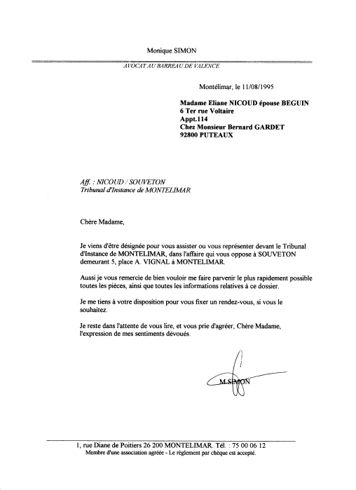 Chère Madame, Je viens d'être désignée pour vous assister ou vous représenter devant le Tribunal d'Instance de MONTELIMAR, dans l'affaire qui vous oppose à SOUVETON demeurant 5, place A. VIGNAL à MONTELIMAR. Aussi je vous remercie de bien vouloir me faire parvenir le plus rapidement possible toutes les pièces, ainsi que toutes les informations relatives à ce dossier. Je me tiens à votre disposition pour vous fixer un rendez-vous, si vous le souhaitez. Je reste dans l'attente de vous lire, et vous prie d'agréer, Chère Madame, l'expression de mes sentiments dévoués.