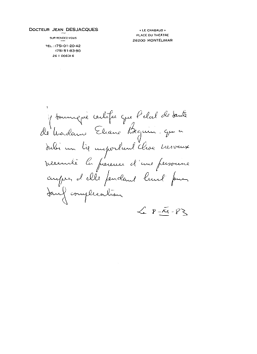 Mme BEGUIN a été victime le 7 Novembre 1983 de violences commises par un individu qui n'a pas été identifié. Cette agression fait l'objet du procès-verbal n° 1689 et n'a pas encore été transmis au Parquet Docteur DESJACQUES Jean contacté par les gendarmes sur place dans ma villa |