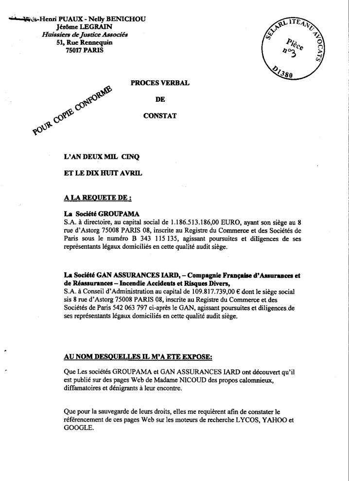 | Huissiers de Justice associés près le Tribunal de Grande Instance de Paris - Procés verbal - Groupama Gan .... |