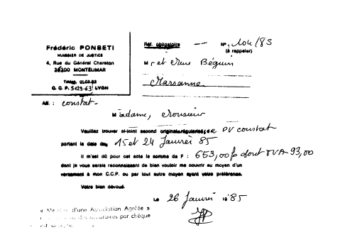 L'AN MIL NEUF CENT QUATRE VINGT CINQ et le QUINZE janvier puis le VINGT QUATRE janvier. A la raquête de Monsieur Yves BEGUIN et son épouse née Eliane NICOUD,