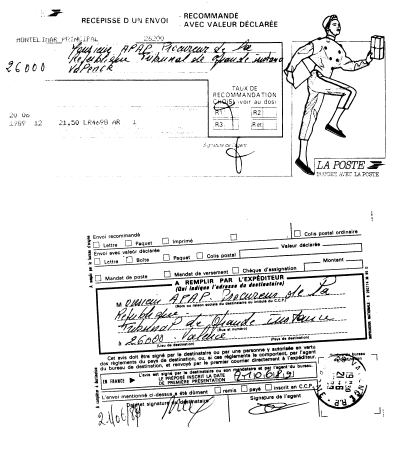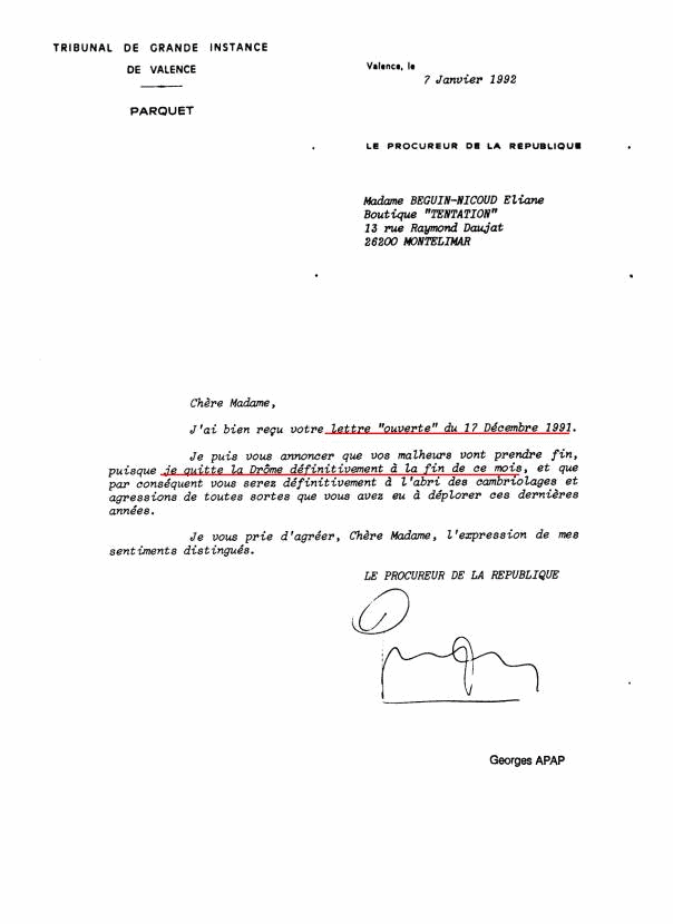 Conscients de votre pouvoir à la direction et au contrôle de la Police Judiciaire de département de la DROME, nous prenons bien sûr la menace du 29 novembre 1991 très au sérieux. Et si les agressions ou procédures judiciaires devaient se renouveler, nous serions dans l'obligation de diffuser des révélations graves sur des "activités" couvertes par le Palais de Justice de Valence, dans la DROME.... en FRANCE....
