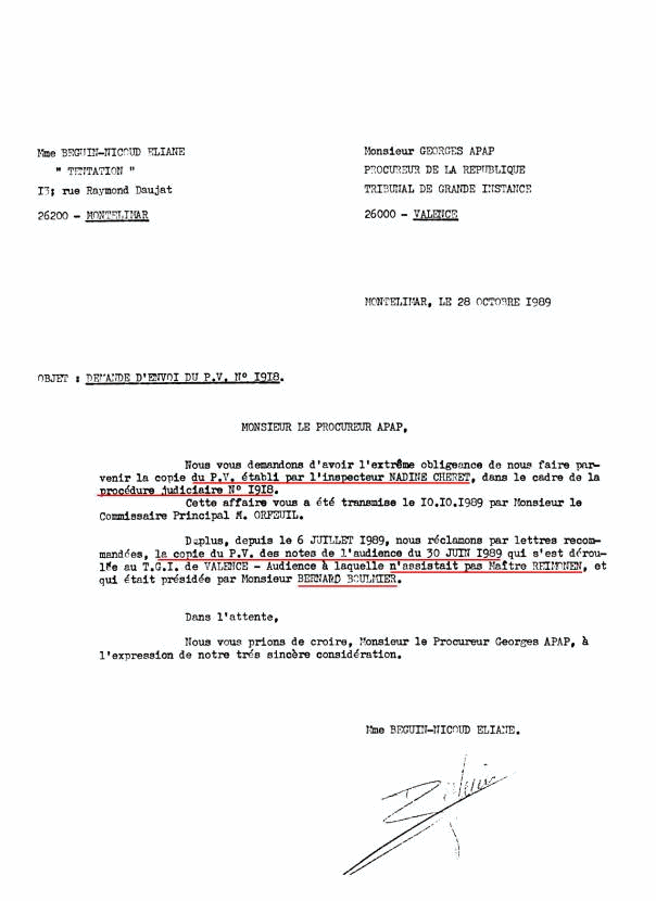 justice Montélimar, le 28/10/1989 - Lettre à Georges APAP Procureur de la république