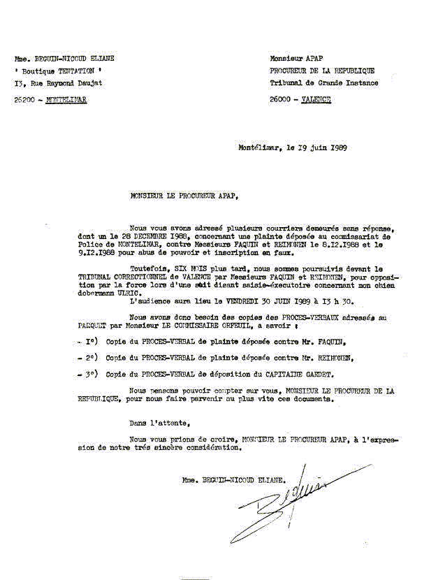 Nous vous avons adresser plusieurs courriers demeurés sans réponse, dont un le 28 décembre 1988, concernant une plainte déposée au  commissariat de Police de Montélimar, contre Messieurs Faquin Reimonen le 8.12.1988 et le 9.12.1988 pour abus de pouvoir et inscription en faux.