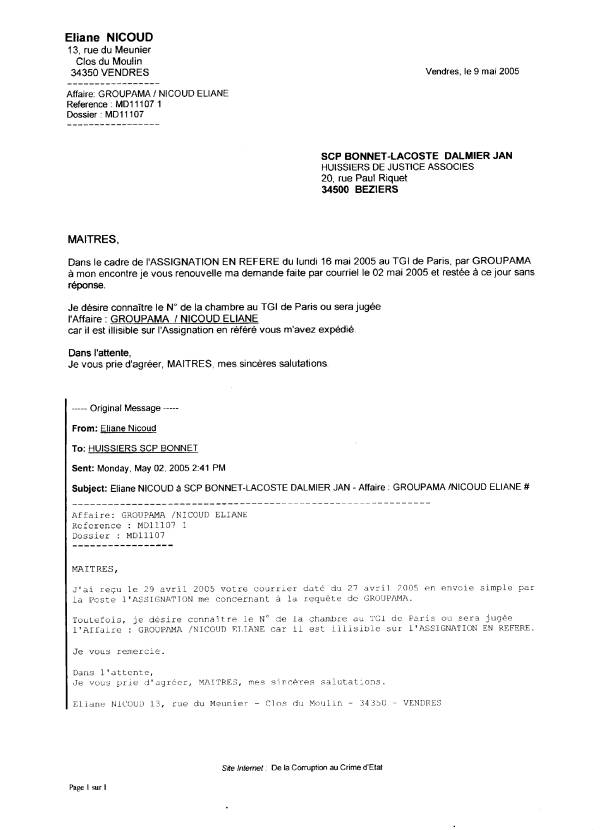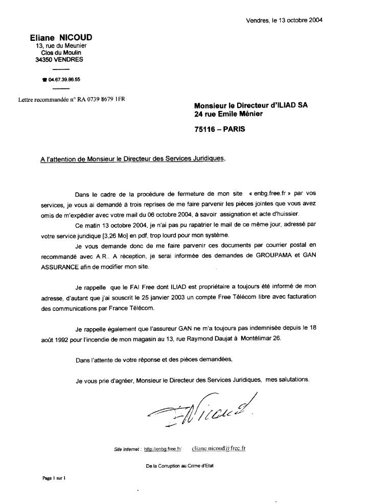 Mon courriel du 20-11-2007 à LEGALIS en attente de réponse ! ... voir Retour lettre à Lycos France Voir aussi : http://eliane.nicoud.free.fr/justice/assignation/assi2005.html |