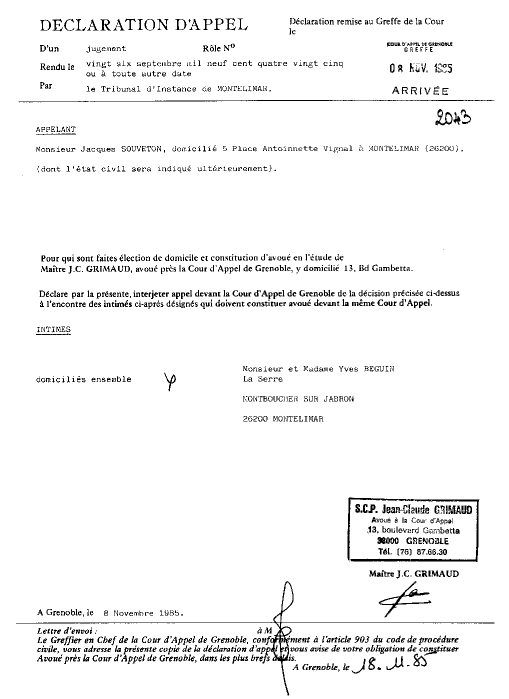 | 08 novembre 1985 - Déclaration d'Appeldu vétérinaire Jacques Souveton | ||