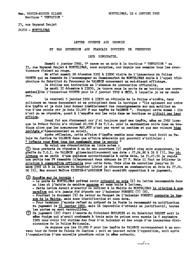 Samedi 4 janvier 1992, troisième casse en un mois à la boutique "Tentation" au 13, rue Raymond Daujat, sans surprise, car depuis une semaine tous les avertisseurs étaient au rouge. En effet samedi 28 décembre 1991 à 11 H 00 visite de l'inspecteur de police Brunth qui me demande de l'accompagner au Commissariat de Montélimar suite à l'appel téléphonique du Substitut du Procureur de Valence concernant un soi-disant affichage. Je décline son invitation en l'absence de convocation officielle. Le mardi 31 décembre à II H 30, je trouve sous la porte de ma boutique une convocation de l'inspecteur de police Brunth pour le 2 janvier 1992 à 8 H 30, à laquelle je ne me rends pas (pièce 1) [convocation]. Le vendredi 3 janvier 1992 à II H 30 un véhicule de la Police s'arrête, deux policiers en tenue descendent et se précipitent dans la boutique : "Ils agissent sur ordre des impôts et je dois leur donner immédiatement des renseignements sur mon mobilier en vue d'une saisie car je dois 10.000 F aux impôts de Valence" ???. Pourquoi cette somme : ils n'ont pu me répondre, quant à l'enquête sur les vols dans ma boutique ce n'était pas leur affaire.