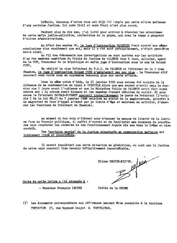 Au début des années 80, le juge d'instruction Brossier était arrivé aux mêmes conclusions plus rapidement que moi, mais il a été muté précipitamment, c'était peut-être mieux ainsi. Au fil des événements nos investigations se sont portées sur les activités d'un des membres caméléons du Palais de Justice de Valence tour à tour, policier, agent de la D.S.T., Procureur de la République et enfin juge d'instruction sous le nom de Roland Cuer. En réalité le vice président du T.G.I. de Valence et Président de la 2 ième Chambre, le juge Roland Cuer n'existerait pas non plus. Le Procureur Apap pourrait sans doute nous en apprendre beaucoup plus sur cette affaire. Dans le même ordre d'idée, le 11 janvier 1990 nous avions été surpris de la clémence de ma condamnation en Appel à Grenoble alors que mon avocat n'avait reçu le dossier que 2 jours avant l'audience et que le Ministère Public de Valence avait fait appel contre moi : la prison avait disparu et les amendes étaient réduites de moitié. Et pour cause le Président Sarraz-Bournet occupait irrégulièrement le poste de Président (l'article 1 de la loi 88.23 du 7 janvier 1988 relative au statut de magistrature, interdit à un magistrat de Cour d'Appel atteint par la limite d'âge et maintenu en activité, d'exercer les fonctions de Président de Chambre). Au moment où des voix s'élèvent pour dénoncer le manque de liberté de la Justice face au Pouvoir Politique, il suffit d'ouvrir et de feuilleter mes dossiers de procédures pour constater les carences de son fonctionnement depuis dix ans dans la Drôme et bien au-delà. Une "certaine partie" de la Justice structurée en organisation mafieuse est totalement libre et incontrôlée. Il serait inquiétant que cette situation se généralise, au quel cas la Justice de notre pays pourrait bien devenir définitivement incontrôlable. Copie de cette lettre a été adressée à :