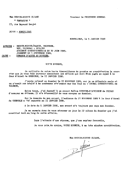 Je sollicite de votre haute bienveillance de prendre en considération le courrier que je vous fais parvenir concernant une affaire qui doit être jugée en appel à la Cour d'Appel de Grenoble, le 11 janvier 1990. J'avais préparé ce dossier le 13 novembre 1989, car je me défendais seule et on n'avait pas hésité à me condamner sévèrement sur des faux au Tribunal Correctionnel de Valence. Entre temps, j'ai demandé à mon avocat Maître Ribeyre-D'Abrigeon de Privas d'assurer ma défense. Il m'a conseillé de vous envoyer ce dossier. Sur la demande de mon avocat, l'audience du 25 novembre 1989 à la Cour d'Appel de Grenoble a été reportée au 11 janvier 1990. A la date du 5 janvier 1990, mon avocat n'a toujours pas reçu mon dossier. Je me permets donc de vous adresser ce jour les 22 pièces du dossier que j'ai constitué tout au long de cette affaire. Dans l'attente d'une réponse rapide, que j'ose espérer favorable, Je vous prie de croire, Votre Honneur, à ma très sincère considération. Madame Béguin-Nicoud Eliane |