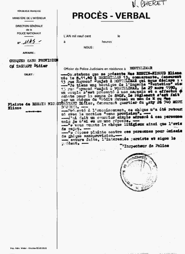 PLAINTE contre Didier TAGNANT pour chèque impayé sur crédit Mutuel PV. N° 1145
