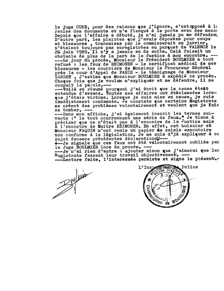 SUR LES FAITS --- Je prends connaissance du motif de ma convocation. Le 5 septembre 1989 je suis passé au tribunal correctionnel de VALENCE pour : RESISTANCE A AGENT DE LA FORCE PUBLIQUE, a l'issue du procés j'ai été condamnée à trois mois de prison avec sursis plus une somme de 2500F à verser à Monsieur FAQUIN et 2500F à Maître REIMONEN. --- Cette affaire s'est produite le 8 décembre 1988. J'avais été convoqué pour le 30 juin au Tribunal. Mi-juin , j'ai apposé une première affiche sur la vitrine de mon magasin sis 13 rue Raymond Daujat où j'expliquai l'affaire. Debut juillet, j'ai affiché une deuxième pancarte dans laquelle je rendais compte du résultat de l'audience du 30 juin 1989. Ce jour, Maître REIMONEN était absent et la séance était reportée au 5 septembre. Le 5 septembre, j'ai donc été condamnée. --- Hier matin, à l'ouverture de mon magasin, j'ai affiché une feuille relatant ma condamnation, les sommes que je devais verser et quelques commentaires. J'ai posé cette affiche comme je l'avais fait les précédentes fois pour expliquer l'affaire. --- Dans la dernière affiche, j'ai écrit " la cause étant entendue d'avance". Je vais m'expliquer sur ce termes. Je signale que dans cette affaire, je ne me suis pas faite représenter par un avocat. Je me suis défendue seule. Depuis le 30 juin, je demandais à avoir copie des procès verbauxl. J'ai écrit à ce sujet six lettres auquelles je n'ai jamais eu de réponse. Il y a toujours un blocage de la part de la Justice. Les magistrats ne m'ont jamais donné satisfaction, hormis une personne, le greffier en chef de Monsieur APAP qui était d'accord pour me donner copie du dossier. Cependant le juge CUER, pour des raisons que j'ignore, s'est opposé à la remise des documents et m'a flanqué à la porte avec des menaces. Depuis que l'affaire a débuté, je n'ai jamais pu me défendre. D'autre part, les plaintes que j'avais déposées pour coups et blessures, transmises par le commissaire en janvier n'étaient toujours pas enregistrées au parquet de VALENCE le 26 juin 1989. Il n'y a jamais eu de suite. Celà faisait un obstacle de plus de la part de la Justice à mon encontre. Le jour du procès, Monsieur le Président BOULMIER a tout refusé les faux de REIMONEN - le certificat médical de mes blessures - les courriers de Monsieur le Procureur Général près la cour d'Appel de PARIS - le témoignage de Monsieur GARDET. J'estime que Monsieur BOULMIER a expédié ce procès. Chaque fois que je voulais m'expliquer et me défendre, il me coupait la parole. Voilà en résumé pourquoi j'ai écrit que la cause était entendue d'avance. Toutes mes affaires ont été classées lorsque j'étais victime. Lorsque je suis mise en cause, je suis immédiatement condamnée. Je constate que certains Magistrats me créent des problèmes volontairement et veulent que je laisse tomber. Dans mon affiche, j'ai également inscrit les termes suivants : "le tout courronnant une série de faux. Je tiens à préciser que ce n'était pas à l'encontre de la Justice mais à l'encontre de Maître REIMONEN. En effet, cet huissier et Monsieur FAQUIN m'ont remis un papier de saisie exécutoire non conforme à la législation. Je me suis déjà expliquer à ce sujet dans mes précédentes déclarations. Je signale que ces faux ont été volontairement oubliés par le Juge BOULMIER lors du procès. Je n'ai rien d'autre à ajouter sinon que j'aimerai que les Magistrats fassent leur travail objectivement. Lecture faite, l'intéressée persiste et signe le présent. |