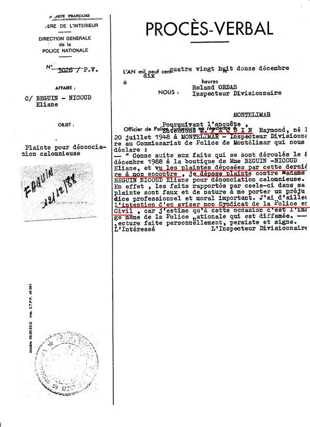 | PV de FAQUIN Raymond Inspecteur de police Montélimar adressé à M. MONDON |