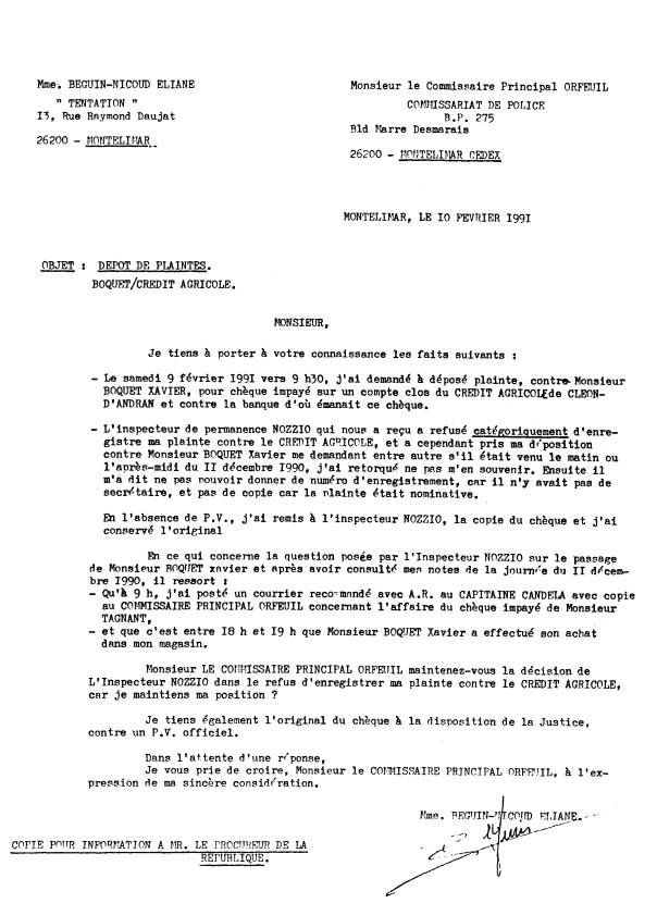 | J'expédie une lettre au Commissaire ORFEUIL pour lui dire que le samedi 9 février 1991, j'ai demandé à porter plainte contre Monsieur BOQUET Xavier, pour chèque impayé sur un compte clos du Crédit Agricole de CLEON-D'ANDRAN et contre la banque d'où émanait ce chèque. L'inspecteur de permanence NOZZIO a refusé categoriquement d'enregistre ma plainte contre le CREDIT AGRICOLE. |