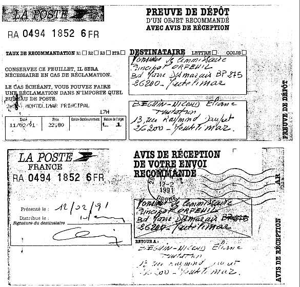 Nous vous demandons d'avoir l'extrême obligeance de nous communiquer le N° d'enregistrement du P.V. de déposition du 7 septembre 1989 faite au commissariat de police de Montélimar, par Madame Béguin-Nicoud Eliane, ainsi que la date de son expédition au Parquet de Valence. Cette déposition, faite sur convocation de Monsieur le Commissaire Principal, a été enregistrée par l'Inspecteur de Police Nadine Cherret. Dans l'attente d'une réponse rapide, Nous vous prions de croire, Monsieur le Commissaire Principal, à l'expression de notre sincère considération. Mme BEGUIN-NICOUD Eliane |