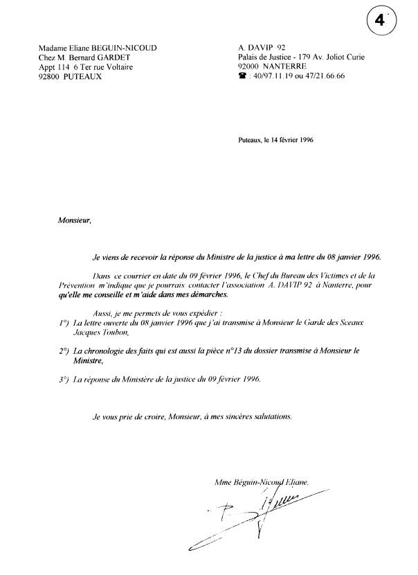 Monsieur, Je viens de recevoir la réponse du Ministre de la justice à ma lettre du 08 janvier 1996. Dans ce courrier en date du 09 février 1996, le Chef du Bureau des Victimes et de la Prévention m'indique que je pourrais contacter l'association A. DA VIP 92 à Nan terre, pour qu'elle me conseille et m'aide dans mes démarches. Aussi, je me permets de vous expédier : 1°) La lettre ouverte du 08 janvier 1996 quej 'ai transmise à Monsieur le Garde des Sceaux Jacques Ton bon, 2°) La chronologie des faits qui est aussi la pièce n°13 du dossier transmise à Monsieur le Ministre, 3°) La réponse du Ministère de la justice du 09 février 1996. Je vous prie de croire, Monsieur, à mes sincères salutations. Mme Béguin-Nicoud Eliane |