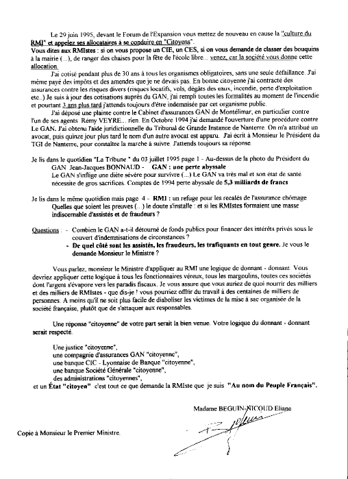 Hébergée et pointant à l'ANPE de Puteaux depuis le mois de septembre 1994, je suis toujours sans ressources, car les assurances GAN jouent aux abonnés absents. J'ai fait une demande de RMI au service social des Hauts de Seine. Il m'a été accordé au mois de novembre 1994.