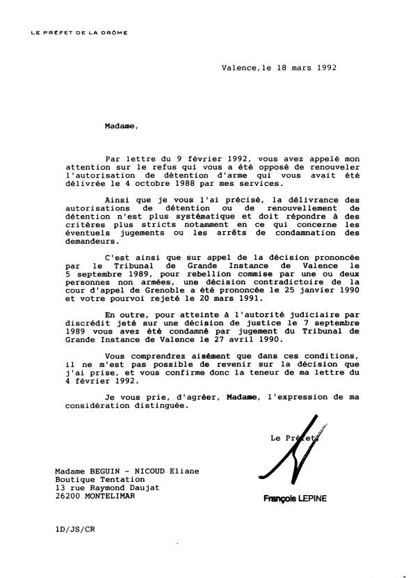 | 18 mars 1992 - Le préfet François Lépine supprime ma détention d'arme que je possede à titre sportif. | ||