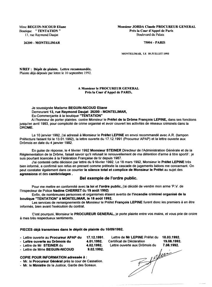 Ai l'honneur de porter plaintes contre Monsieur le Préfet de la Drôme François LEPINE, dans ses fonctions jusqu'en avril 1993, pour complicité de crime organisé et avoir couvert les activités de réseaux criminels dans la DROME. Le 10 janvier 1992, j'ai adressé à Monsieur le Préfet LEPINE en envoi recommandé avec A.R. (tampon Préfecture faisant foi le 13.01.1992), la lettre ouverte du 17.12.1991 (Procureur APAP) et la lettre ouverte aux Drômois en date du 4 janvier 1992. En guise de réponse, le 4 février 1992 Monsieur STEINER Directeur de l'Administration Générale et de la Réglementation de la Drôme, faisait savoir qu'il refusait le renouvellement de ma détention d'arme à titre sportif : je suis pourtant licenciée à la Fédération Française de tir depuis 1987. J'ai contesté cette décision par lettre du 9 février 1992. Le 18 mars 1992, Monsieur le Préfet LEPINE très bien informé, a confirmé son refus en prenant comme prétexte la cascade de jugements bidons me concernant. On peut constater également dans ce courrier le silence total et complice de Monsieur le Préfet au sujet des agressions et des cambriolages. Pour me mettre en conformité avec la loi et l'ordre public, j'ai décidé de vendre mon arme P.V. de l'Inspecteur de Police Nadine CHERRET du 19 août 1992) Enfin, de nombreuses personnes et organismes étaient avertis de l'incendie criminel organisé de la boutique "TENTATION" à MONTELIMAR, le 18 août 1992. Les services de renseignements de Monsieur le Préfet François LEPINE furent donc les premiers à en être informés, bien avant l'exécution du contrat. C'est pourquoi, Monsieur le PROCUREUR GENERAL, je porte plainte entre vos mains, et vous prie de croire à mes très respectueux sentiments. Mme BEGUIN-NICOUD Eliane |
