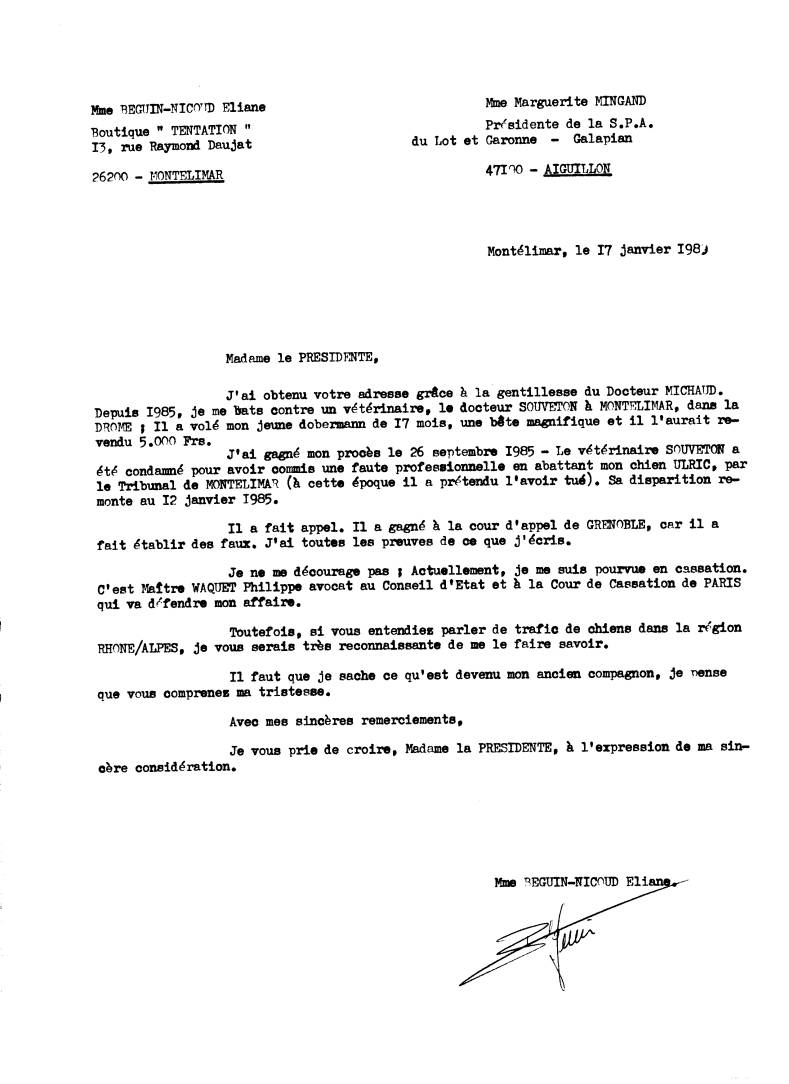 Montélimar, le 15 octobre 1985 Madame, Je voue ai écrit le 28 janvier 1905 pour la première fois, je vous demandais conseil pour la disparition de mon Dobemann ULRIC. Je le croyais mort, tué par Monsieur SOUVETON vétérinaire. Suivant les dirent de ce monsieur, il l’avait piqué, et mis dans son congélateur. Depuis je me bats. Sur vos conseils, j'ai fait un procès à ce Vétérinaire ; procés que je viens de gagner. Il est condamné pour avoir tuer non chien !!... Mais, Madame, le chien qui est dans cette clinique n'est pas le mien. Mon chien était tatoué BGK 997 cuisse droite, celui qui est dans sa clinique est tatoué OGK 997 cuisse gauche. Aussi, je vous en supplie, dites moi ce que je peux faire pour savoir ce que ce vétérinaire a fait de mon chien. Il prétend qu'il ne peut le dire. Dans l’attente d’une réponse dans laquelle je mets tous mes espoirs, Je vous prie de croire, Madame Brigitte BARDOT, à ma très sincère considération. Mme BEGUIN Eliane