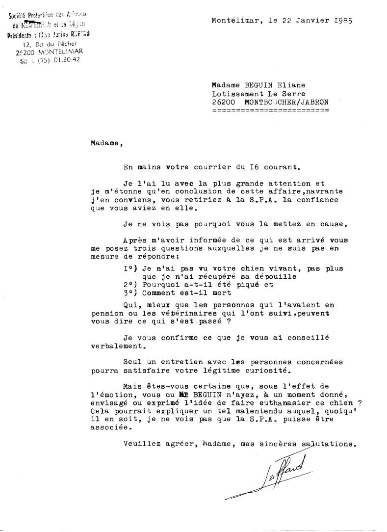 22-01-1985 - Réponse de Mme Riffard Janine Présidente de la S.P.A. de Montélimar et sa Région |